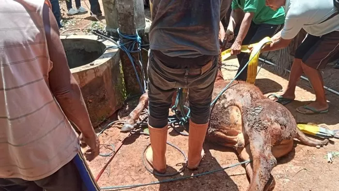 Proses evakuasi berlangsung beberapa jam karena sapi kesulitan bergerak dan lubang yang sempit.